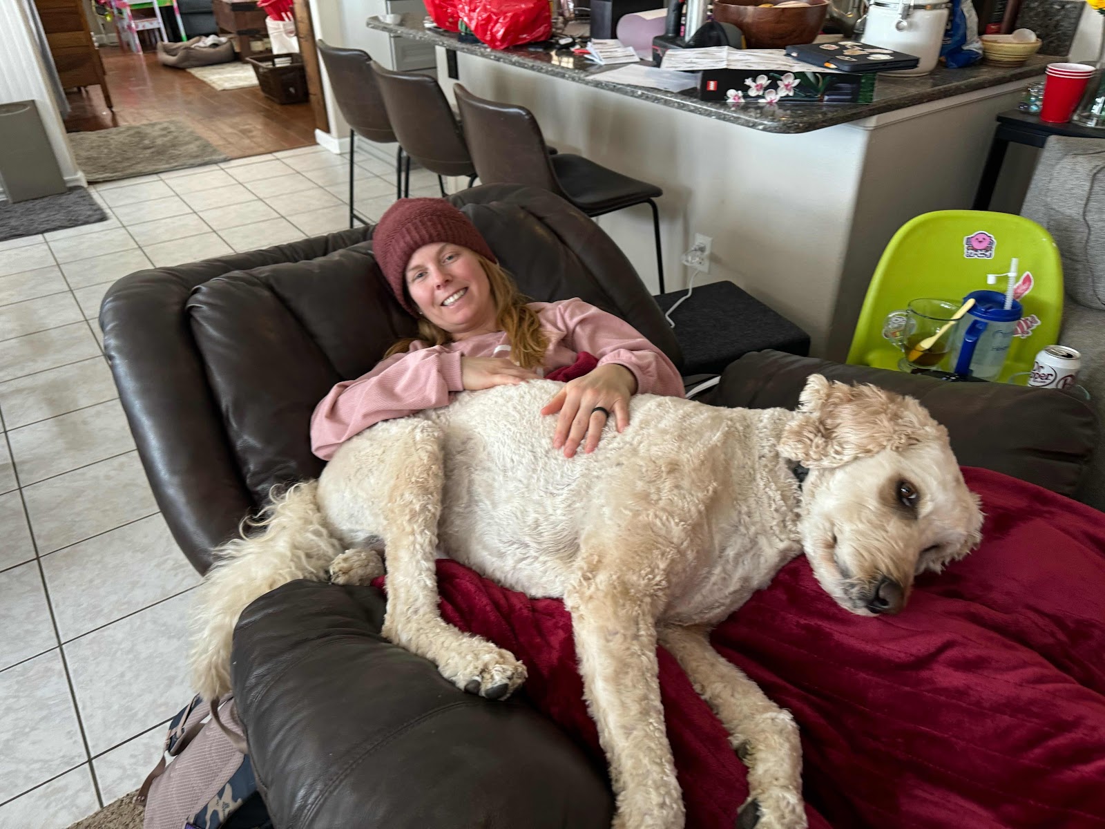 We never had mastered trimming his nails, and we used our vet for that. It seemed worth the $25 for them to do it. I would take him in and he would get taken back. I instantly would hear howling...SCREAMING! People in the waiting room would be looking around because it sounded like a dog was being murdered. THAT was Sam. One lady once scolded me for not giving him anxiety pills and putting him through the whole process. The techs ALWAYS told me that he would start screaming even before they even touched him. Drama. I swear. After COVID the vet quit doing nail trims, so we had to figure it out. BUT WE SURE DID! I flipped him on his back and held him, Dempsey fed the peanut butter, and Russell trimmed. We were a well oiled machine, for FREE!